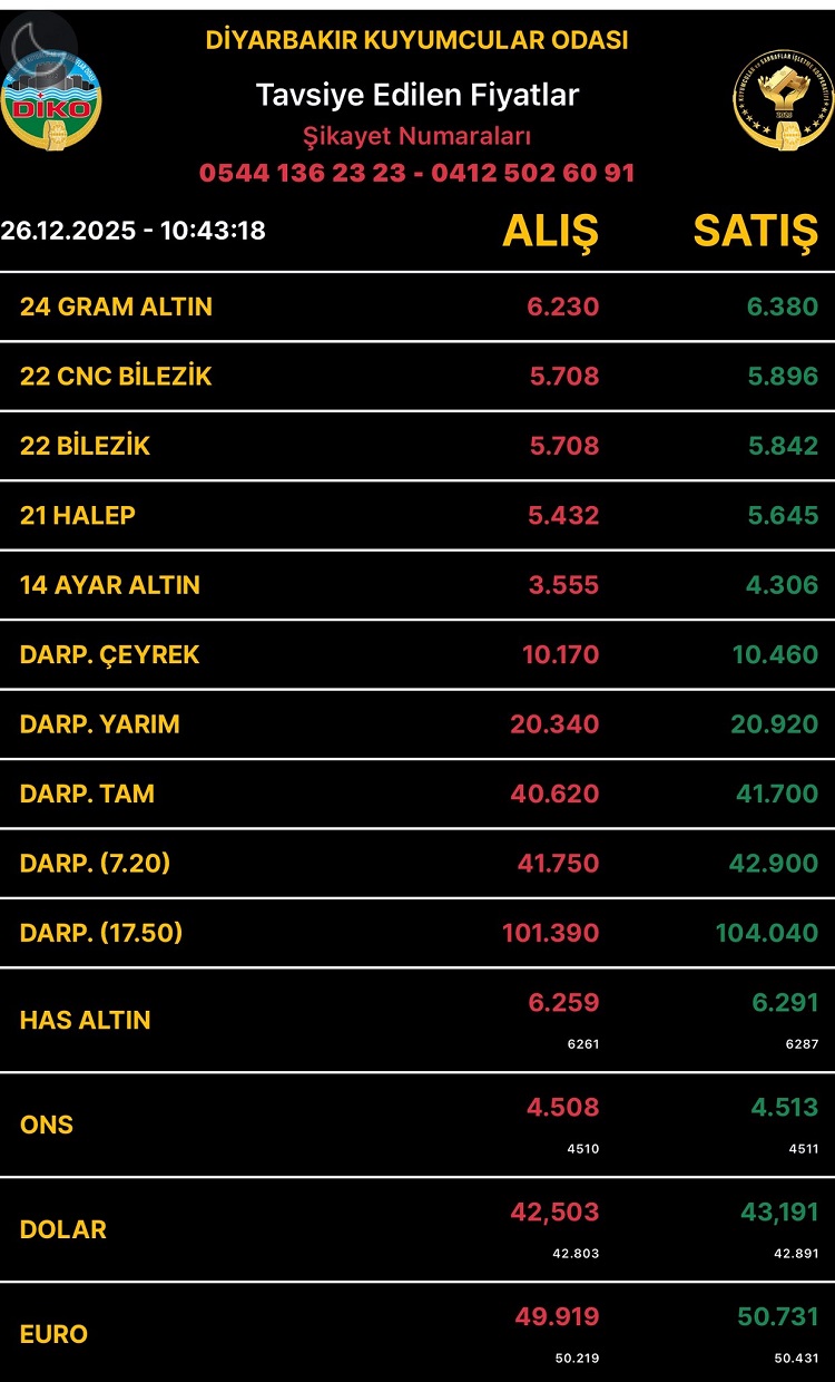 Diyarbakır Kuyumcular Odası açıkladı, altın fiyatlarındaki son tablo belli oldu. Buna göre, gram altın, çeyrek altın, yarım altın ve tam altın fiyatları kaç lira oldu? Piyasaların son durumuna göre, 23 Aralık Salı günü 40 bin 20 TL olan tam altın fiyatları bugün ise (26 Aralık Cuma) 41 bin 700 TL’ye çıkarak 680 liralık bir artış yaşadı.