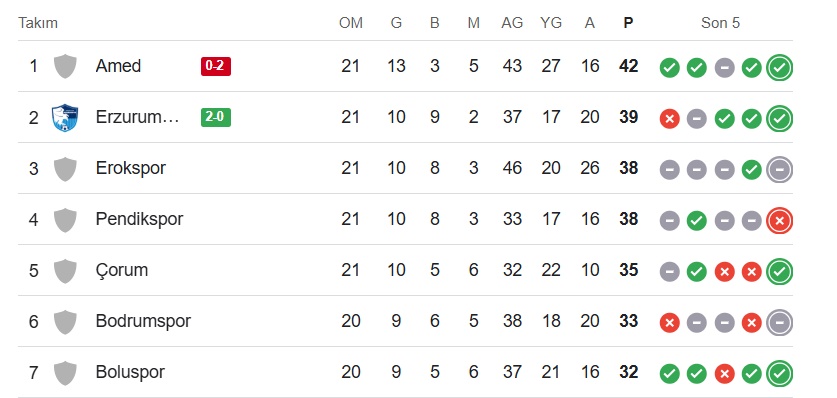 Amedspor, bu sonuçla 42 puanda kalarak liderliğini korurken, Erzurumspor ise puanını 39 yaparak ligde 2’nci sıraya yükseldi.