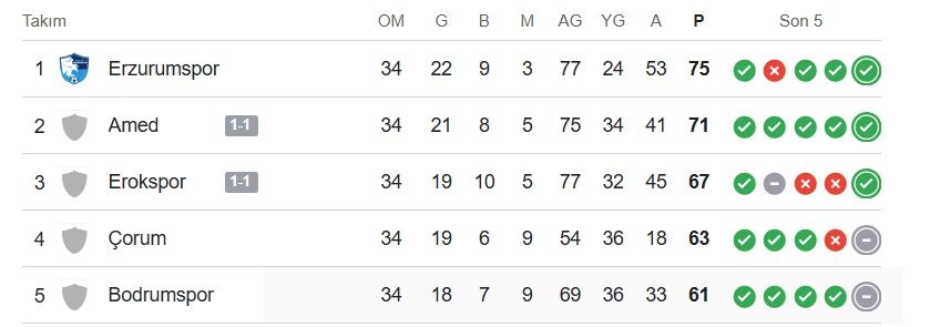 Ligde 2’nci sırada yer alan Amedspor bu sonuçla puanını 71’e, Erokspor ise 67 puana ulaştı. Aradaki 4 puanlık fark korunmuş oldu.