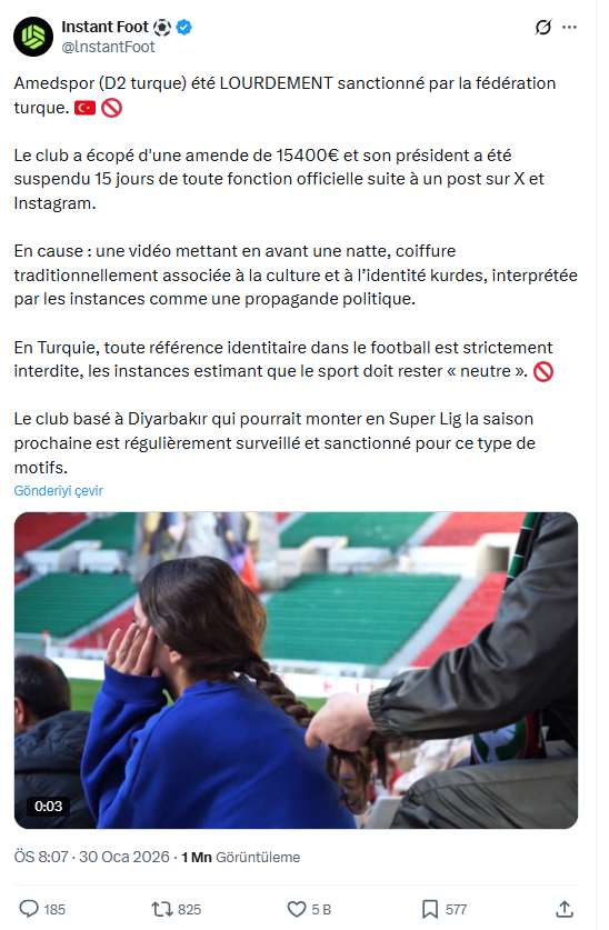 Fransa’daki Instant Foot adlı medyadan Amedspor adına yapılan o haberde kullanılan ifadeler şöyle: Amedspor (Türkiye 1. Ligi) Türkiye Futbol Federasyonu tarafından AĞIR bir şekilde cezalandırıldı. Kulüp, X ve Instagram'da yaptığı bir paylaşım nedeniyle 15400 € para cezasına çarptırıldı ve başkanı 15 gün süreyle tüm resmi görevlerden uzaklaştırıldı.