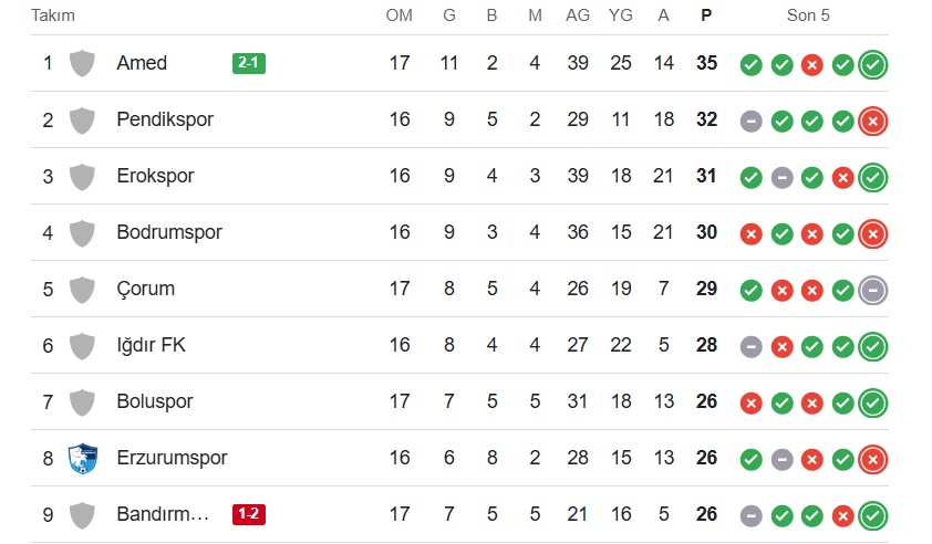 Amedspor, bu galibiyetle puanını 35’e yükselterek maç fazlasıyla tarihinde ilk kez liderlik koltuğuna oturdu.