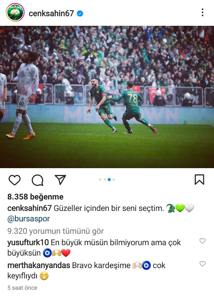 Olaylı Bursaspor Amedspor karşılaşmasının ardından oyuncu Cenk Şahin, ınstagram hesabından maça ait fotoğraflar paylaşarak, “Güzeller içinden bir seni seçtim” notunu yazmıştı.