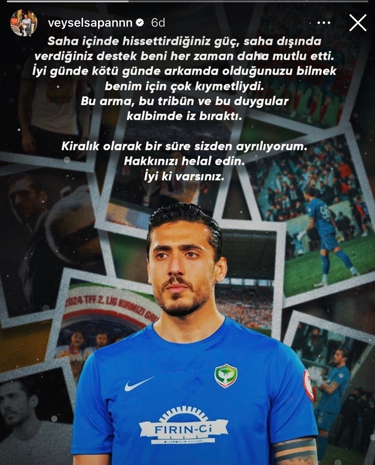 Amedspor’a ve taraftarlara veda açıklaması yapan Veysel Sapan, “Saha içinde hissettirdiğiniz güç, saha dışında verdiğiniz destek beni her zaman daha mutlu etti. İyi günde kötü günde arkamda olduğunuzu bilmek benim için çok kıymetliydi. Bu arma, bu tribün ve bu duygular kalbimde iz bıraktı. Kiralık olarak bir süre sizden ayrılıyorum. Hakkınızı helal edin. İyi ki varsınız” dedi.