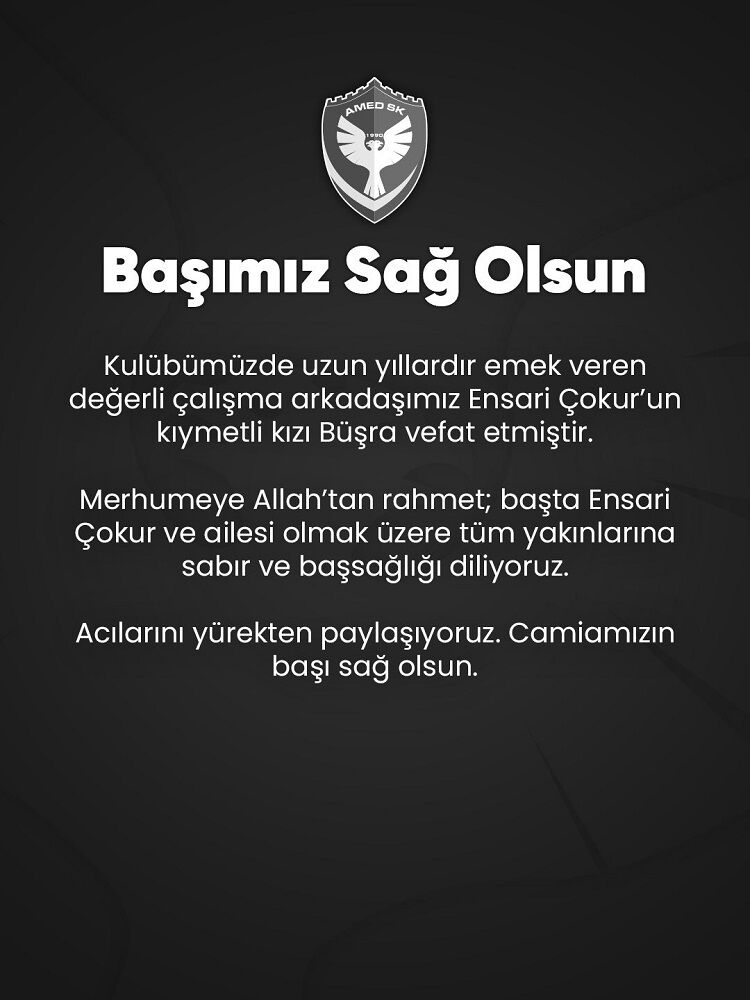 Amedspor camiası, uzun yıllardır kulüp bünyesinde görev yapan emektar personellerinden Ensari Çokur’un kızı Büşra Çokur’un vefat haberiyle derin bir üzüntü yaşıyor.