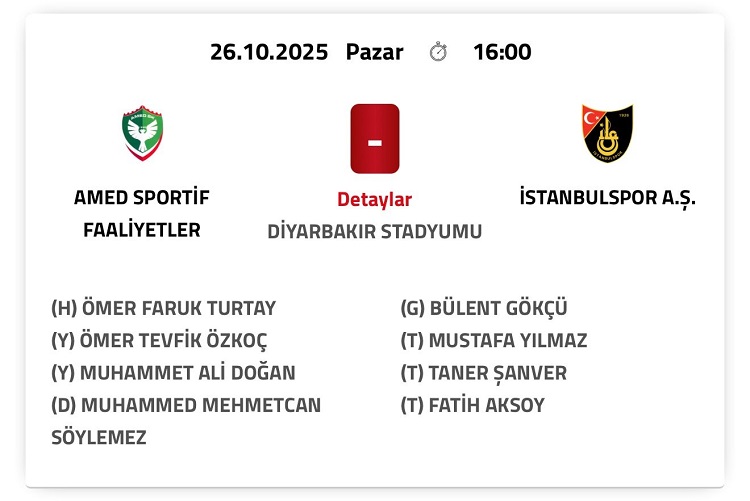 2025/26 sezonunun ilk haftasında Amedspor’un Çorum FK’ya karşın 2/0’lık skorla mağlup olduğu karşılaşmayı yöneten Ömer Faruk Turtay, İstanbulspor maçının da hakemi oldu.