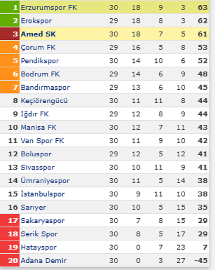 Amedspor’un galip geldiği maçın ardından 12 maçlık galibiyet serisi bulunan Erzurumspor ise bir başka İstanbul takımı olan Ümraniyespor’a karşın 3/1’lik skorla mağlup oldu ve şampiyonluk yolunda büyük yara aldı ve Amedspor’la arasındaki puan farkı 2’ye düşmüş oldu.