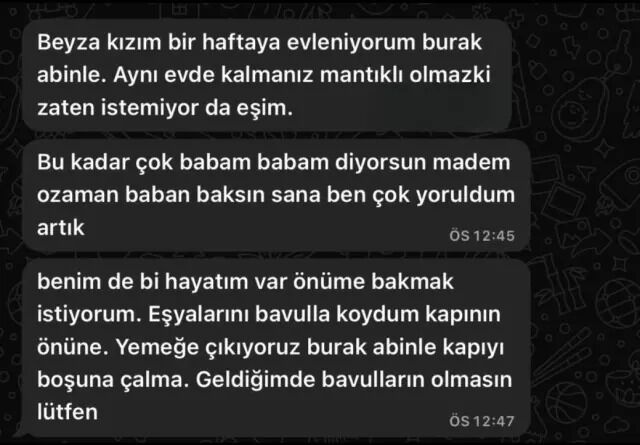 Mesajların devamında annenin, "Bu kadar babam babam diyorsun, o zaman baban baksın sana. Benim de bir hayatım var." ifadelerini kullandığı yer aldı.
