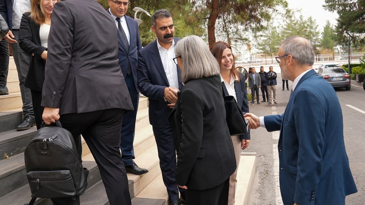 AB delegasyonu heyeti Büyükşehir Belediyesi Eşbaşkanları Serra Bucak ve Doğan Hatun tarafından belediyenin protokol kapısında karşılandı.