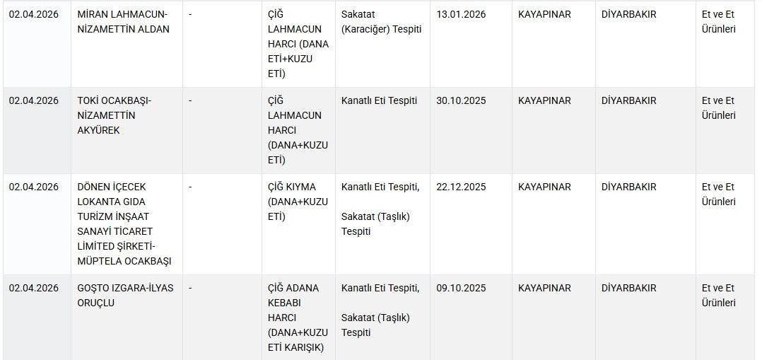 Bakanlık verilerine göre, Diyarbakır’ın merkez Kayapınar ilçesinde hizmet veren 4 restoranı ifşa etti. Miran Lahmacun’a ait ‘çiğ lahmacun harcı (dana eti+kuzu eti)’ ürününde sakatat (karaciğer) tespit edilirken, TOKİ Ocakbaşı’na ait ‘çiğ lahmacun harcı (dana+kuzu eti)’ ürününde kanatlı eti bulunduğu açıklandı. Müptela Ocakbaşı’na ait ‘çiğ kıyma (dana+kuzu eti)’ ürününde kanatlı eti ve sakatat (taşlık), Goşto Izgara’ya ait ‘çiğ Adana kebabı harcı (dana+kuzu eti karışık)’ ürününde de benzer şekilde kanatlı eti ve sakatat (taşlık) tespit edildi.