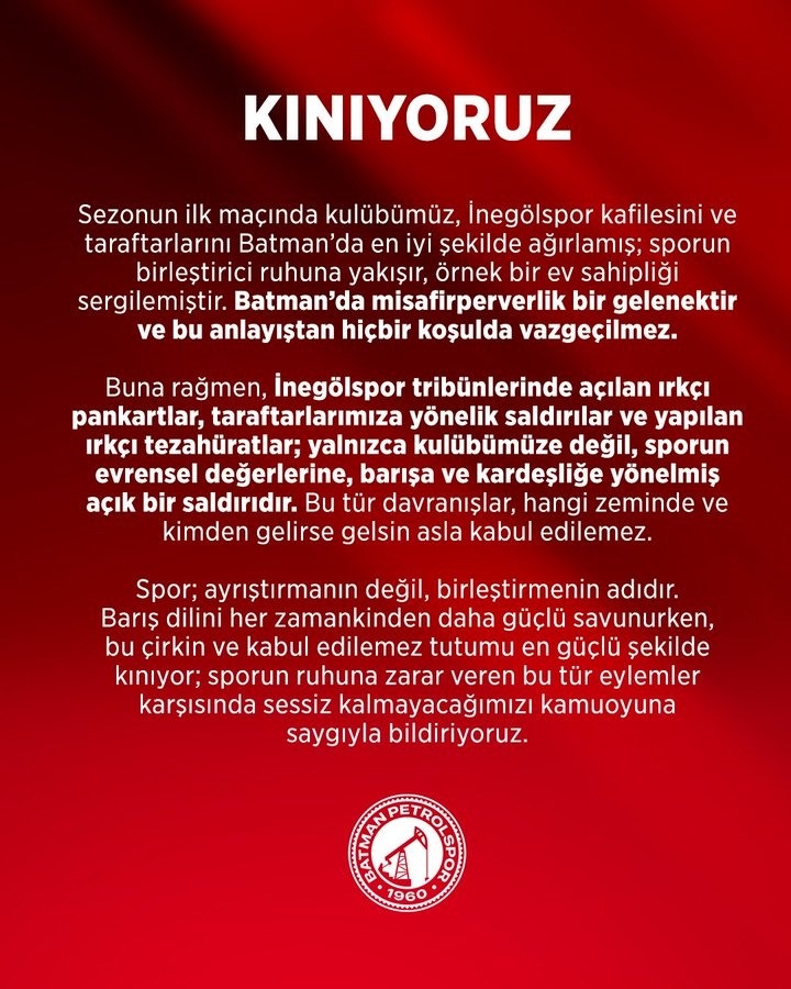 Açıklamada şu ifadelere yer verildi: “KINIYORUZ... Sezonun ilk maçında kulübümüz, İnegölspor kafilesini ve taraftarlarını Batman’da en iyi şekilde ağırlamış; sporun birleştirici ruhuna yakışır, örnek bir ev sahipliği sergilemiştir. Batman’da misafirperverlik bir gelenektir ve bu anlayıştan hiçbir koşulda vazgeçilmez.