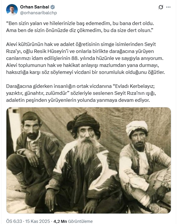 Sarıbal, sosyal medya platformu X üzerinden yaptığı paylaşımda, Seyit Rıza'nın "Ben sizin önünüzde diz çöktüm, bu da size dert olsun" sözlerine yer verdi.