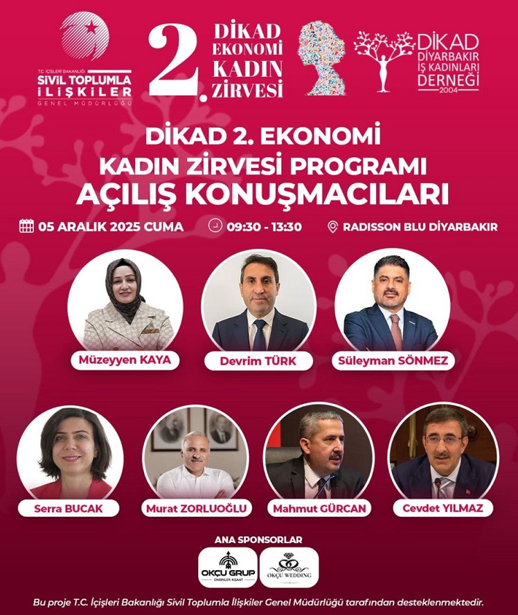 Diyarbakır İş Kadınları Derneği’nin bu yıl ikincisini düzenleyeceği buluşma, 5 Aralık 2025 Cuma günü 9.30-13.30 saatleri arasında kentteki bir otelde gerçekleşecek. Zirveye Diyarbakır Valisi Murat Zorluoğlu, Diyarbakır Büyükşehir Belediyesi Eş Başkanı Serra Bucak ve kentteki iş dünyasının tanınan isimlerinin de katılacağı öğrenildi.