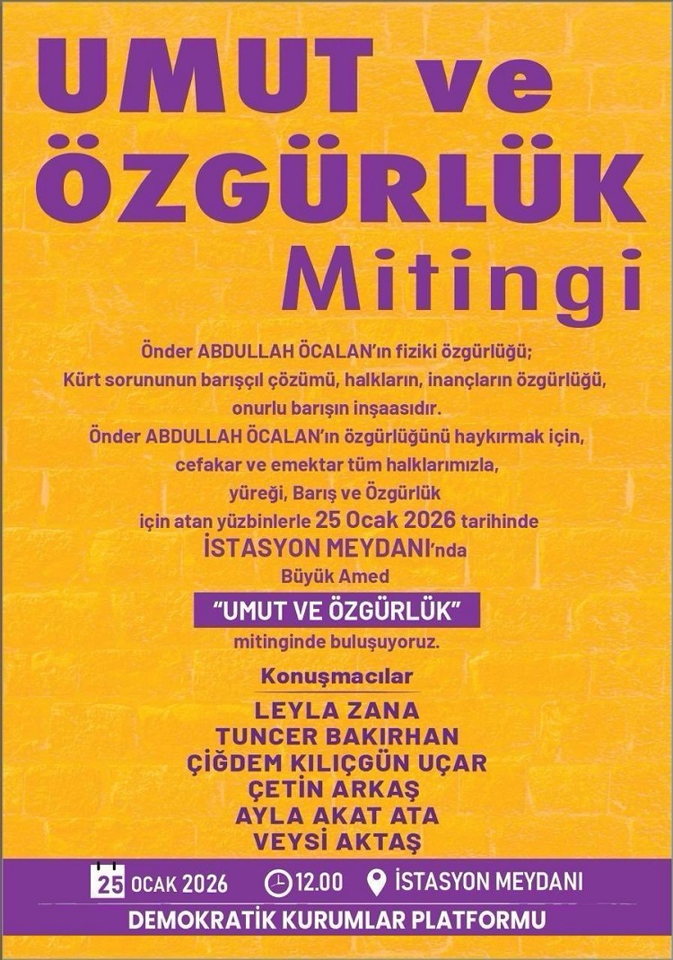 Diyarbakır, 25 Ocak 2026 tarihinde geniş katılımlı bir organizasyona ev sahipliği yapmaya hazırlanıyor. Demokratik Kurumlar Platformu tarafından organize edilen ve DEM Parti Diyarbakır İl Örgütü aracılığıyla duyurulan "Umut ve Özgürlük" mitingi, İstasyon Meydanı’nda gerçekleştirilecek.