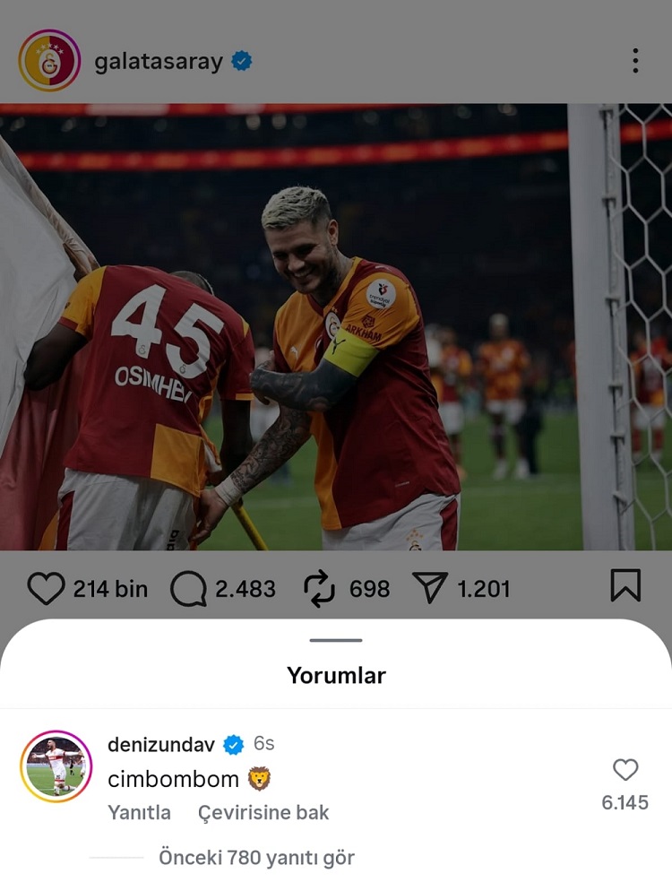 Undav, Galatasaray'ın bir antrenman paylaşımına "Cimbombom" ifadesini yazarak yanıt verdi. Bu kısa ama anlam yüklü yorum, Aslanlar'ın sadık taraftarlarını mest ederken, futbolseverler arasında da ilgi odağı haline geldi. "Cimbombom", Galatasaray'ın en sevilen marşlarından birinin nakaratı olarak biliniyor ve kulübün tutkulu ruhunu simgeliyor.
