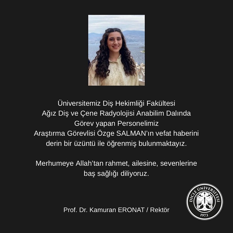 Öte yandan Dicle Üniversitesi Rektörü Prof. Dr. Kamuran Eronat, Salman’ın hayatını kaybetmesiyle ilgili başsağlığı mesajı yayınladı. Eronat mesajında, “Üniversitemiz Diş Hekimliği Fakültesi Ağız Diş ve Çene Radyolojisi Anabilim Dalında görev yapan personelimiz araştırma görevlisi Özge Salman’ın vefat haberini derin bir üzüntü ile öğrenmiş bulunmaktayız. Merhumeye Allah’tan rahmet, ailesine, sevenlerine baş sağlığı diliyoruz” ifadelerini kullandı.