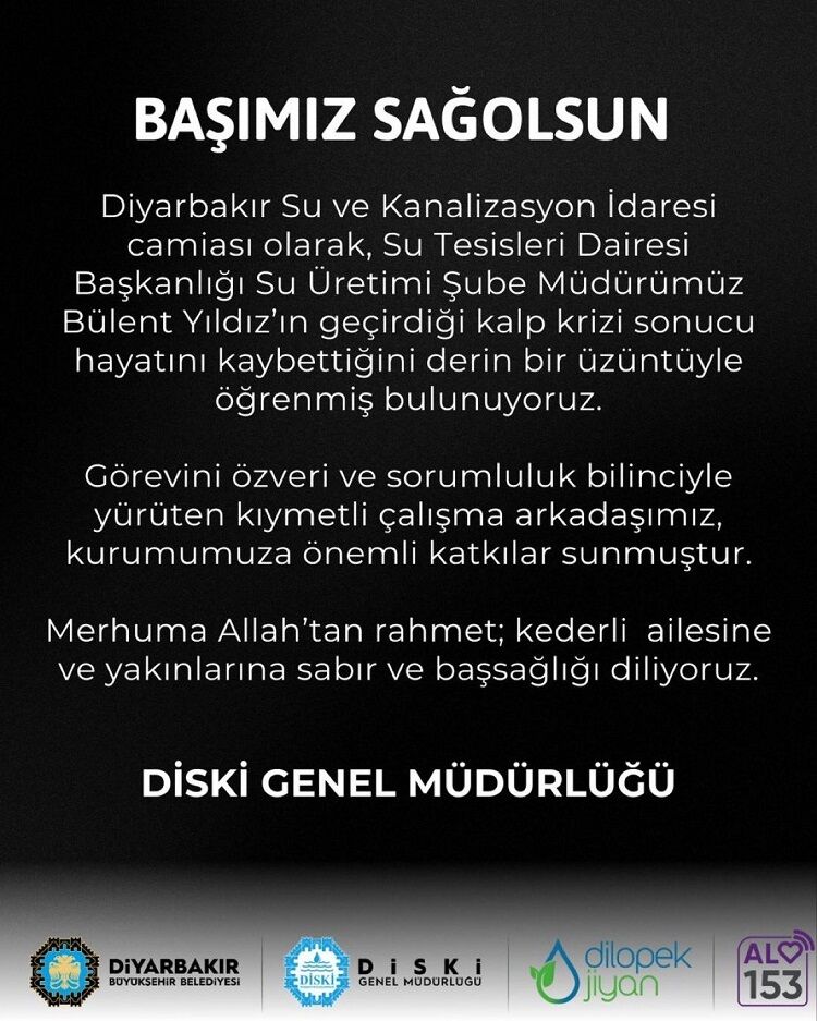 Diyarbakır Su ve Kanalizasyon İdaresi Genel Müdürlüğü tarafından yapılan resmi açıklamada, Su Tesisleri Dairesi Başkanlığına bağlı Su Üretimi Şube Müdürü Bülent Yıldız’ın vefat haberi büyük bir üzüntüyle paylaşıldı.