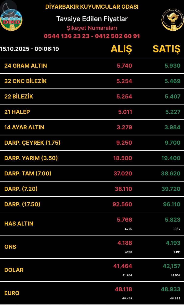 Diyarbakır Kuyumcular Odası (DİKO) altın fiyatlarını duyurdu. Buna göre, gram altın, çeyrek altın, yarım altın ve tam altın fiyatları belli oldu. Peki, altın piyasasındaki son durum ne oldu?