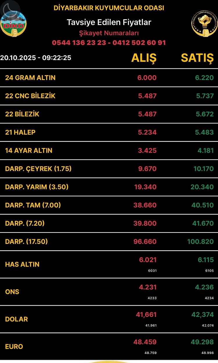 Diyarbakır Kuyumcular Odası 20 Ekim Pazartesi günü için altın fiyatlarında tavsiye edilen miktarı açıkladı. Buna göre, gram altın, çeyrek altın, yarım altın ve tam altın fiyatlarındaki düşüş dikkat çekti.