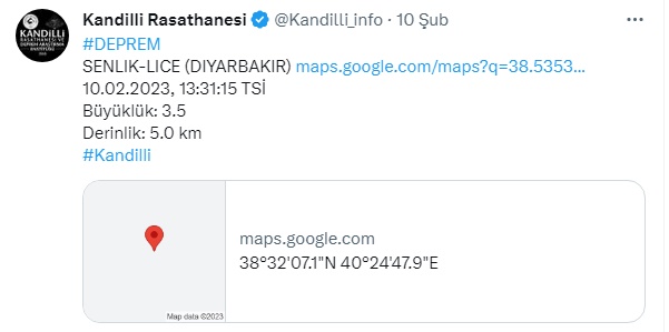 Boğaziçi Üniversitesi Kandilli Rasathanesi ve Deprem Araştırma Enstitüsü'den alınan bilgiye göre, saat 13:31'de merkez üssü Lice ilçesinde 3.5 şiddetinde deprem kaydedildi. Depremin 5 kilometre derinlikte meydana geldiği belirlendi. (Haber Merkezi)