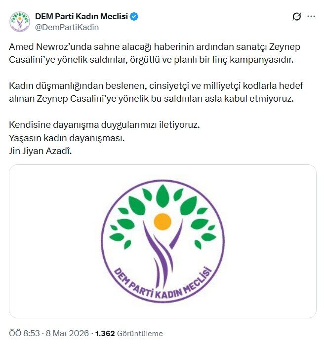 “Amed Newroz’unda sahne alacağı haberinin ardından sanatçı Zeynep Casalini’ye yönelik saldırılar, örgütlü ve planlı bir linç kampanyasıdır.