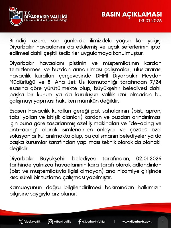 Diyarbakır Valiliği’nden yapılan açıklamada ise, “Diyarbakır Büyükşehir belediyesi tarafından, 02.01.2026 tarihinde yalnızca havaalanının kara tarafı olarak adlandırılan (pist ve müştemilatıyla ilgisi olmayan) ana nizamiye girişinde kısa süreli bir tuzlama çalışması yapılmıştır” denildi.
