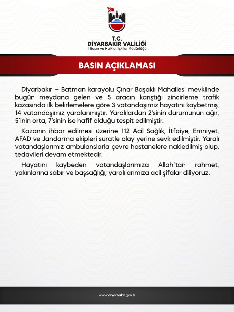 Diyarbakır Valiliği, meydana gelen kazaya ilişkin açıklama yaptı. Valilikte yapılan açıklamada, Diyarbakır-Batman karayolunda 5 aracın karıştığı zincirleme trafik kazasında ilk belirlemelere göre 3 kişinin hayatını kaybettiği, 14 kişinin yaralandığı belirtildi.