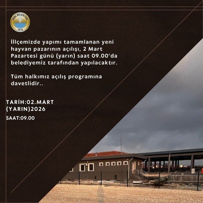 Belediyeden yapılan açıklamaya göre, yapımı tamamlanan hayvan pazarı 2 Mart Pazartesi günü saat 09.00’da düzenlenecek törenle açılacak. Açılış programına halk davet edildi.