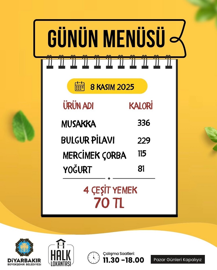 Diyarbakır Büyükşehir Belediyesi’ne bağlı Halk Lokantası, dar gelirli vatandaşların bütçesine destek olmak amacıyla uygun fiyatlı yemek hizmetini sürdürüyor. Bugün (8 Kasım) için açıklanan menüde musakka, bulgur pilavı, mercimek çorbası ve yoğurt yer alıyor. Toplam 70 TL karşılığında sunulan 4 çeşit yemek, dengeli ve besleyici bir öğün sunuyor.