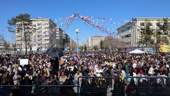 Tevgera Jinên Azad (TJA) ile Dicle Amed Kadın Platformu (DAKP) tarafından 8 Mart Dünya Emekçi Kadınlar Günü kapsamında Diyarbakır İstasyon Meydanı’nda miting gerçekleştirildi. Kentin farklı noktalarından gelen kadınlar, meydanda bir araya gelerek 8 Mart’ı kutladı. Miting, sanatçı Beser Şahin'in seslendirdiği stranlar eşliğinde çekilen halaylarla son buldu.