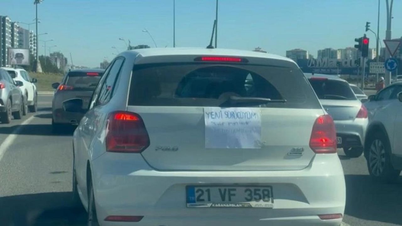 Merkez Kayapınar ilçesi Mezopotamya Bulvarı'nda bir sürücü, otomobilin arka camına "yeni sürücüyüm, sabır imandandır" yazılı not yapıştırarak trafiğe çıktı.