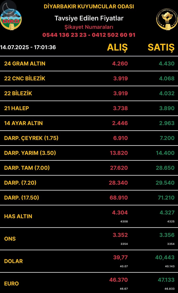 Kuyumcular Odası 14 Temmuz 2025 Pazartesi günü için altın fiyatlarındaki son durumu paylaştı. Buna göre, altın fiyatları son günlerde birbirine yakın seviyelerde yer aldı. Peki, fiyatlar ne durumda?