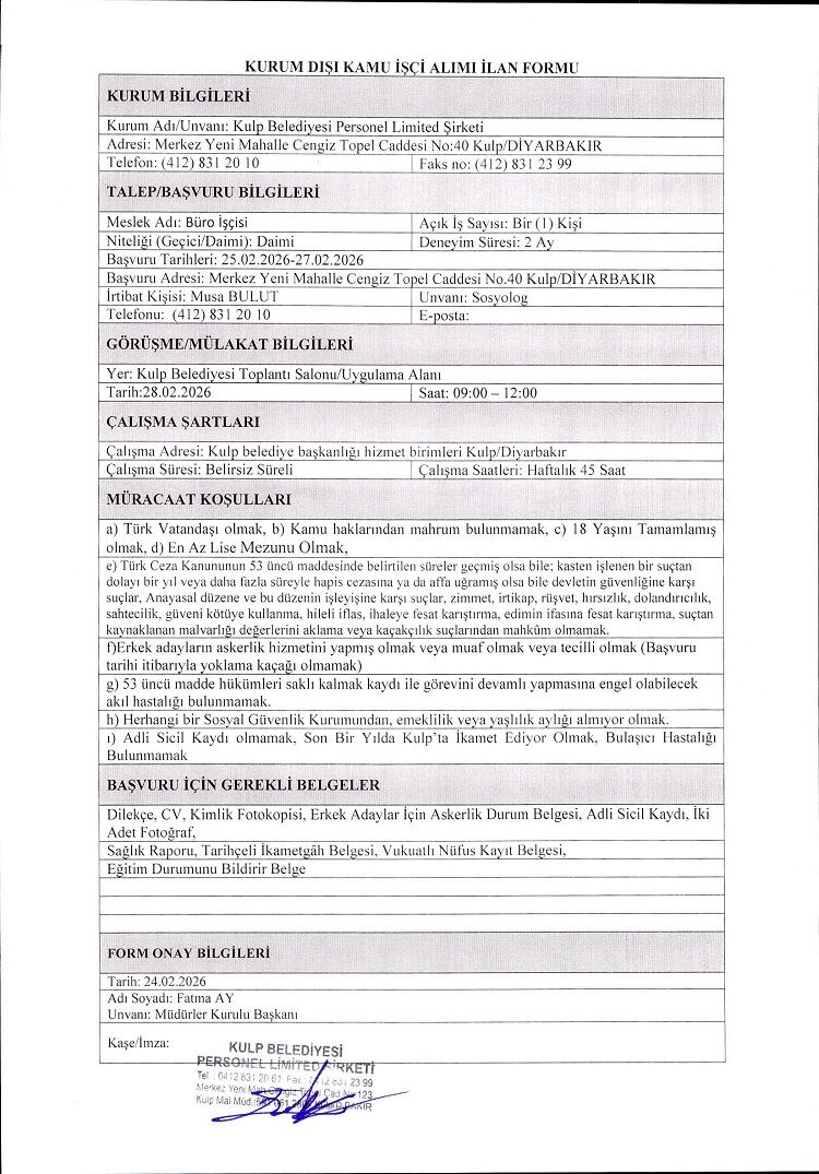 Kulp Belediyesi bünyesinde çalışmak isteyen adaylar için başvuru kapıları 25 Şubat 2026 tarihi itibarıyla açıldı. Adayların başvurularını en geç 27 Şubat 2026 mesai bitimine kadar tamamlamaları gerekiyor.
