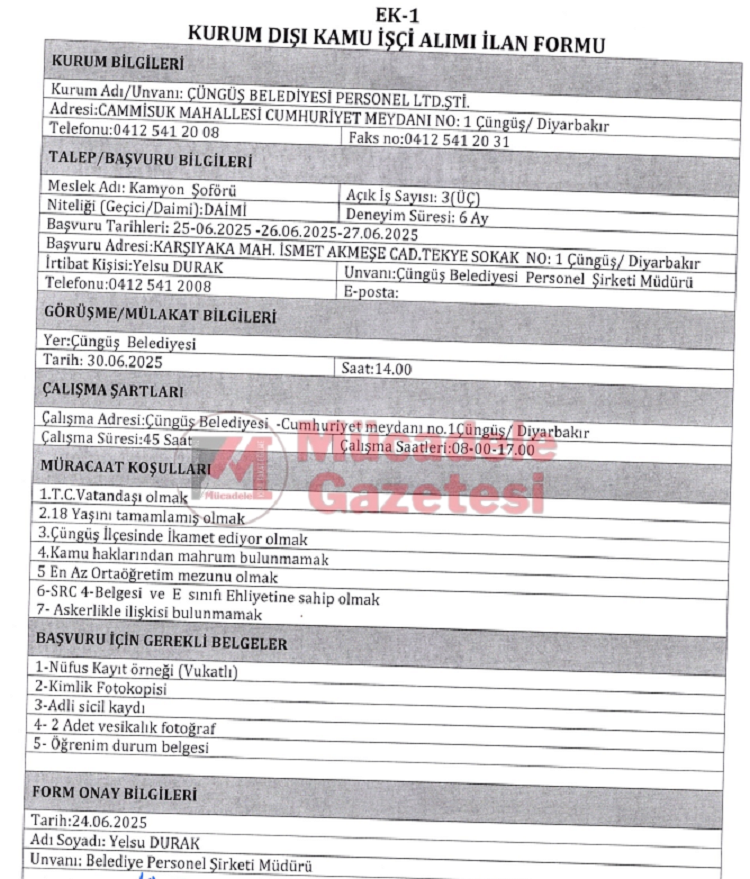 Personel alımı için yapılacak olan başvuruların adresi olarak Çüngüş ilçesi Karşıyaka Mahallesi İsmet Akmeşe Caddesi Tekye Sokak Numara 1 duyuruldu. Başvuruların irtibatı ise Çüngüş Belediyesi Personel Şirketi Müdürüne yapılacak.