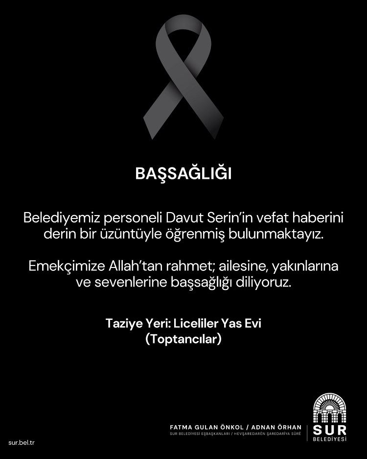 Sur Belediyesi tarafından yayımlanan başsağlığı mesajında, Davut Serin’in kurum bünyesinde özveriyle görev yaptığı belirtilerek, “Belediyemiz personeli Davut Serin’in vefat haberini derin bir üzüntüyle öğrenmiş bulunmaktayız. Merhuma Allah’tan rahmet; ailesine, yakınlarına ve sevenlerine başsağlığı ve sabır diliyoruz.” ifadelerine yer verildi.