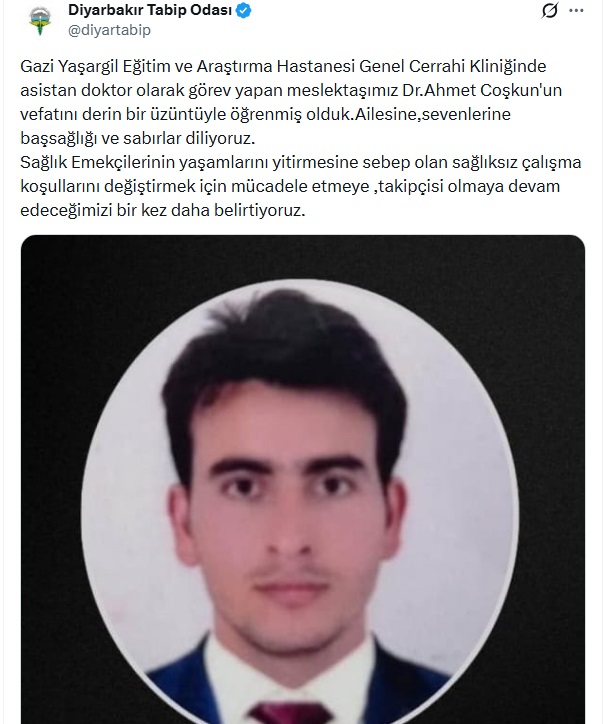“Gazi Yaşargil Eğitim ve Araştırma Hastanesi Genel Cerrahi Kliniğinde asistan doktor olarak görev yapan meslektaşımız Dr. Ahmet Coşkun'un vefatını derin bir üzüntüyle öğrenmiş olduk. Ailesine, sevenlerine başsağlığı ve sabırlar diliyoruz. Sağlık Emekçilerinin yaşamlarını yitirmesine sebep olan sağlıksız çalışma koşullarını değiştirmek için mücadele etmeye, takipçisi olmaya devam edeceğimizi bir kez daha belirtiyoruz.”