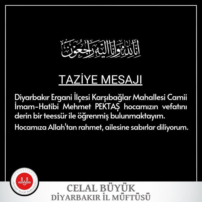 Pektaş’ın ölümüne ilişkin Diyarbakır İl Müftüsü Celal Büyük, başsağlığı mesajı yayınladı. Büyük mesajında, “Ergani İlçesi Karşıbağlar Mahallesi Camii İmam-Hatibi Mehmet Pektaş hocamızın vefatını derin bir teessür ile öğrenmiş bulunmaktayım. Hocamıza Allah'tan rahmet, ailesine sabırlar diliyorum" ifadelerini kullandı.