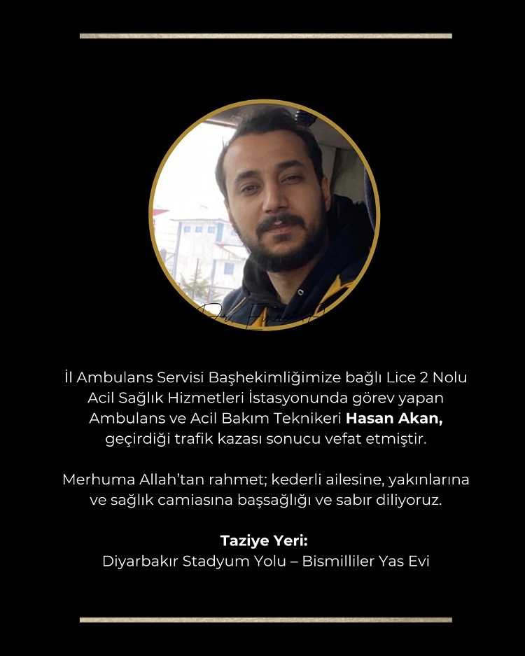 “İl Ambulans Servisi Başhekimliğimize bağlı Lice 2 Nolu Acil Sağlık Hizmetleri İstasyonunda görev yapan Hasan Akan, geçirdiği trafik kazası sonucu vefat etmiştir.