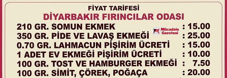 Diyarbakır Fırıncılar Odası Başkanlığı’nın talebiyle Valiliğin aldığı karar doğrultusunda ekmeğe zam geldi. Bu göre, 420 gramı 25 TL’ye satılan Diyarbakır ekmek 350 gramaja düşürülerek fiyatı değiştirilmedi. Somun ekmek ise 12.5 liradan 15 liraya yükseldi.
