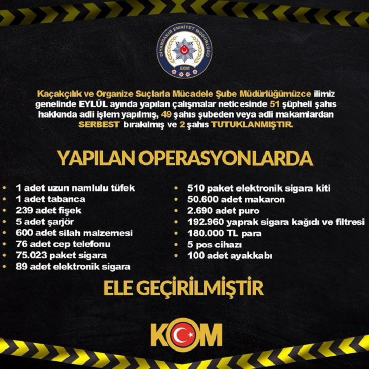 Diyarbakır İl Emniyet Müdürlüğü, Eylül ayı boyunca il genelinde gerçekleştirdiği operasyonların bilançosunu açıkladı. Yürütülen çalışmalar neticesinde toplam 51 şüpheli şahıs hakkında adli işlem yapıldı.