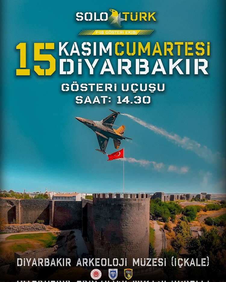 Diyarbakır semaları, SOLOTÜRK'ün nefes kesici manevralarına sahne olacak. Gösteri, tarihi Diyarbakır Arkeoloji Müzesi (İçkale) önünden izlenebilecek.