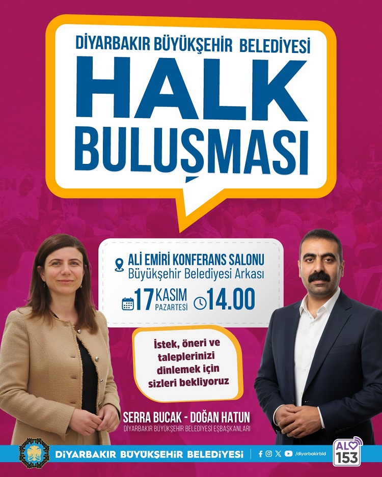 Diyarbakır Büyükşehir Belediyesi, Eşbaşkanlar Serra Bucak ve Doğan Hatun'un katılacağı bir "Halk Buluşması" düzenlediğini duyurdu. Belediyeden yapılan açıklamada, tüm vatandaşlar istek, öneri ve taleplerini doğrudan iletmek üzere toplantıya davet edildi.