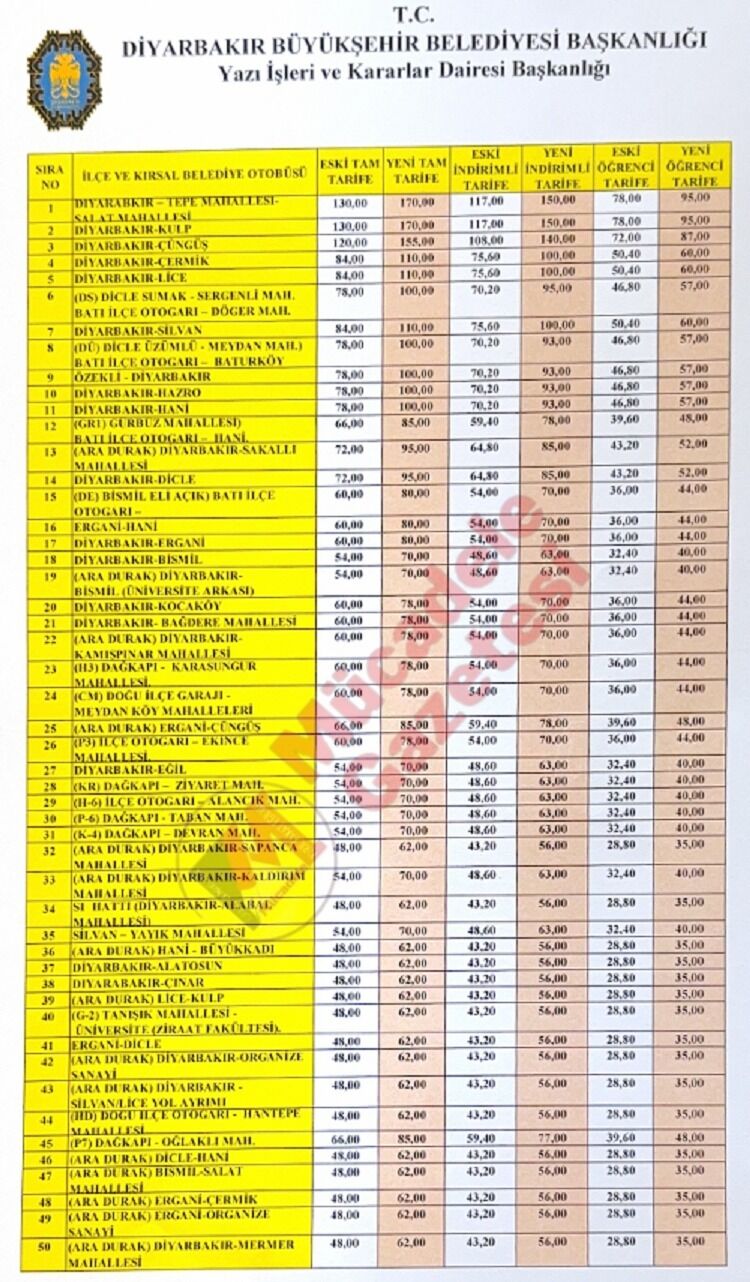 Diyarbakır Büyükşehir Belediyesi’ne ait otobüslerde ise yeni yapılan zamla birlikte tam ve öğrenci tarifesi şu şekilde oldu: