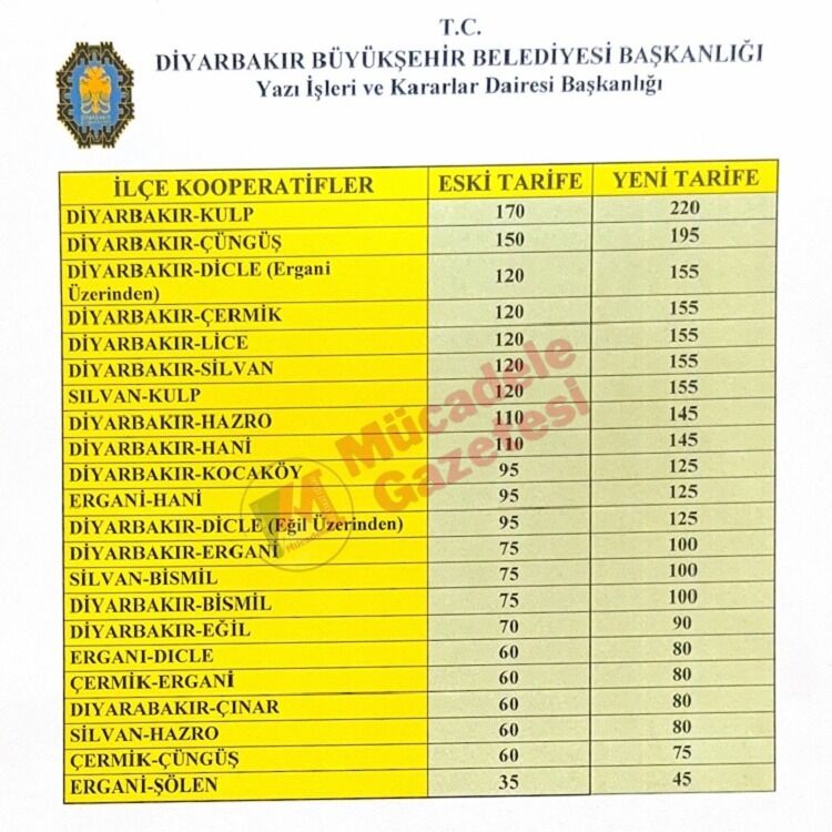 Diyarbakır ve ilçeleri arasındaki ulaşım ücretlerine beklenen zam geldi. Yeni tarifeye göre Diyarbakır-Kulp ve Diyarbakır-Çüngüş hatları en yüksek ücretli rotalar olurken, en kısa mesafeli hatlarda da fiyatlar güncellendi.