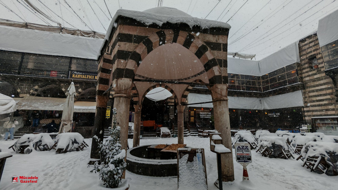 Güneydoğu Anadolu genelinde etkisini gösteren kar yağışları, Sur ilçesindeki günlük yaşamı ve ticari faaliyetleri de durma noktasına getirdi. Hanın avlusunu kaplayan beyaz örtü, kartpostallık görüntüler oluştursa da bölge esnafı kepenk indirmek zorunda kaldı.