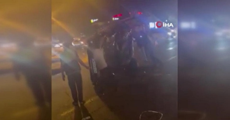 Takla atıp ters dönen otomobili çevredeki vatandaşlar el birliği ile düzelttiler.