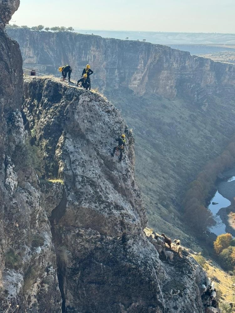 Ekipler, dik olan bölgeye inmek için yanlarında getirdikleri halat yardımıyla kayalıklardan aşağı sarkarak keçileri mahsur kaldıkları yerden tek tek yukarı çıkartıp sahibine teslim etti.