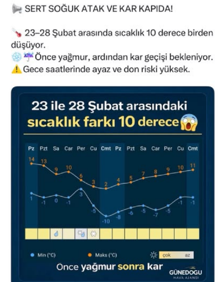 Güneydoğu Hava Ajansı verilerine göre, sıcaklık düşüşü önümüzdeki günlerde etkisini iyice artıracak. Özellikle 26 Şubat ve sonrası için yapılan uyarılar, soğuk hava dalgasının ciddi bir şekilde hissedileceğini gösteriyor.