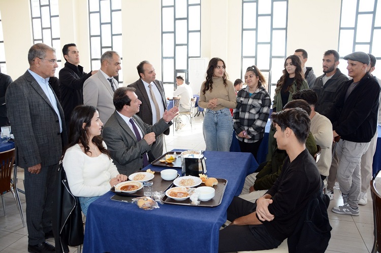 Öğrencilerle beraber yemek yiyen Dicle Üniversitesi Rektörü Prof. Dr. Kamuran Eronat'ın öğrencilerle kurduğu samimi iletişim dikkatlerden kaçmadı.