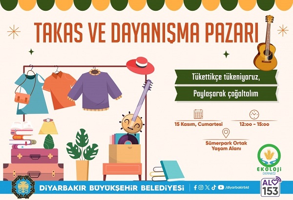 İklim Değişikliği ve Sıfır Atık Dairesi Başkanlığı ile Ekoloji Derneği işbirliğiyle, tüketim kültürüne karşı paylaşımı yaygınlaştırmak amacıyla “Tükettikçe tükeniyoruz, paylaşarak çoğaltalım” mottosuyla etkinlik gerçekleştirilecek. Etkinlik, 15 Kasım Cumartesi Saat 12.00 ile 15.00 saatleri arasında Sümerpark’ta gerçekleştirilecek. Giyim, teknoloji ürünleri ile kitap, dergi ve takılar gibi birçok ürünün yer alacağı pazarda, yurttaşlar istediği ürünü yanlarında getirdikleri ürünlerle değiştirebilecek.