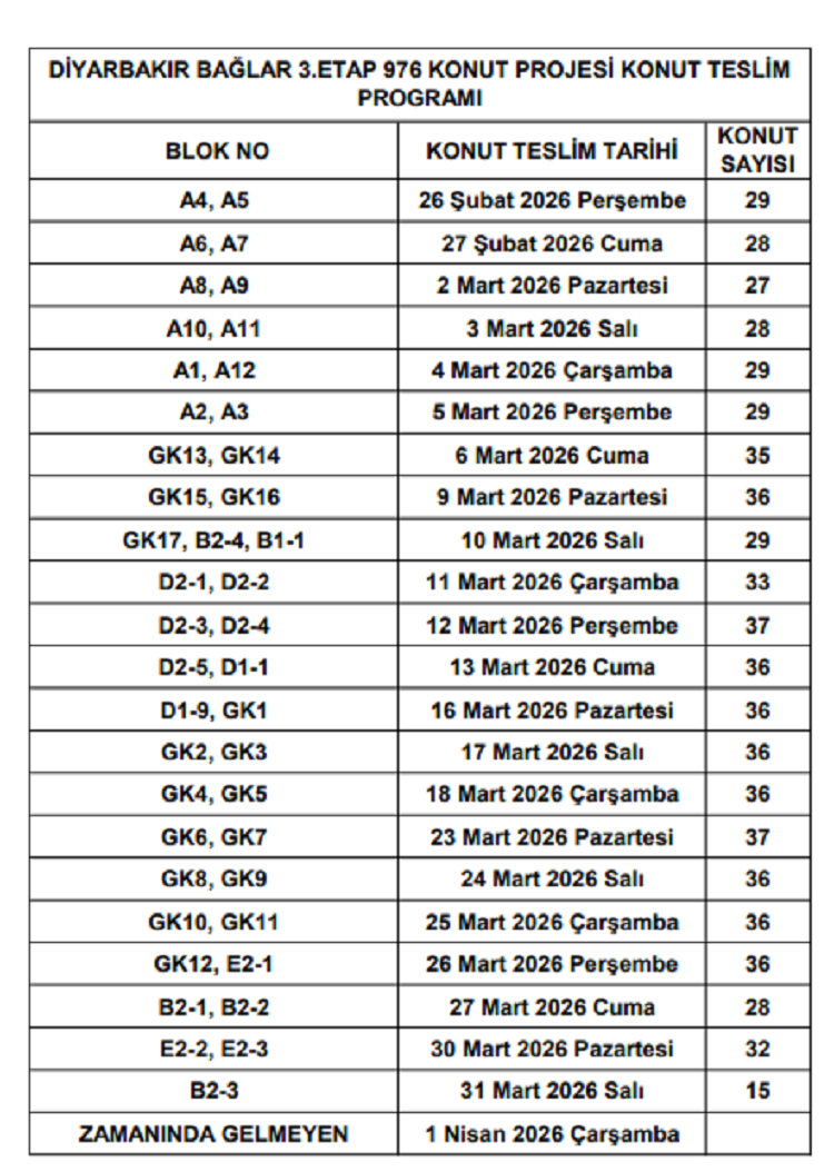 BLOK BAZLI TESLİMAT TAKVİMİ AÇIKLANDI